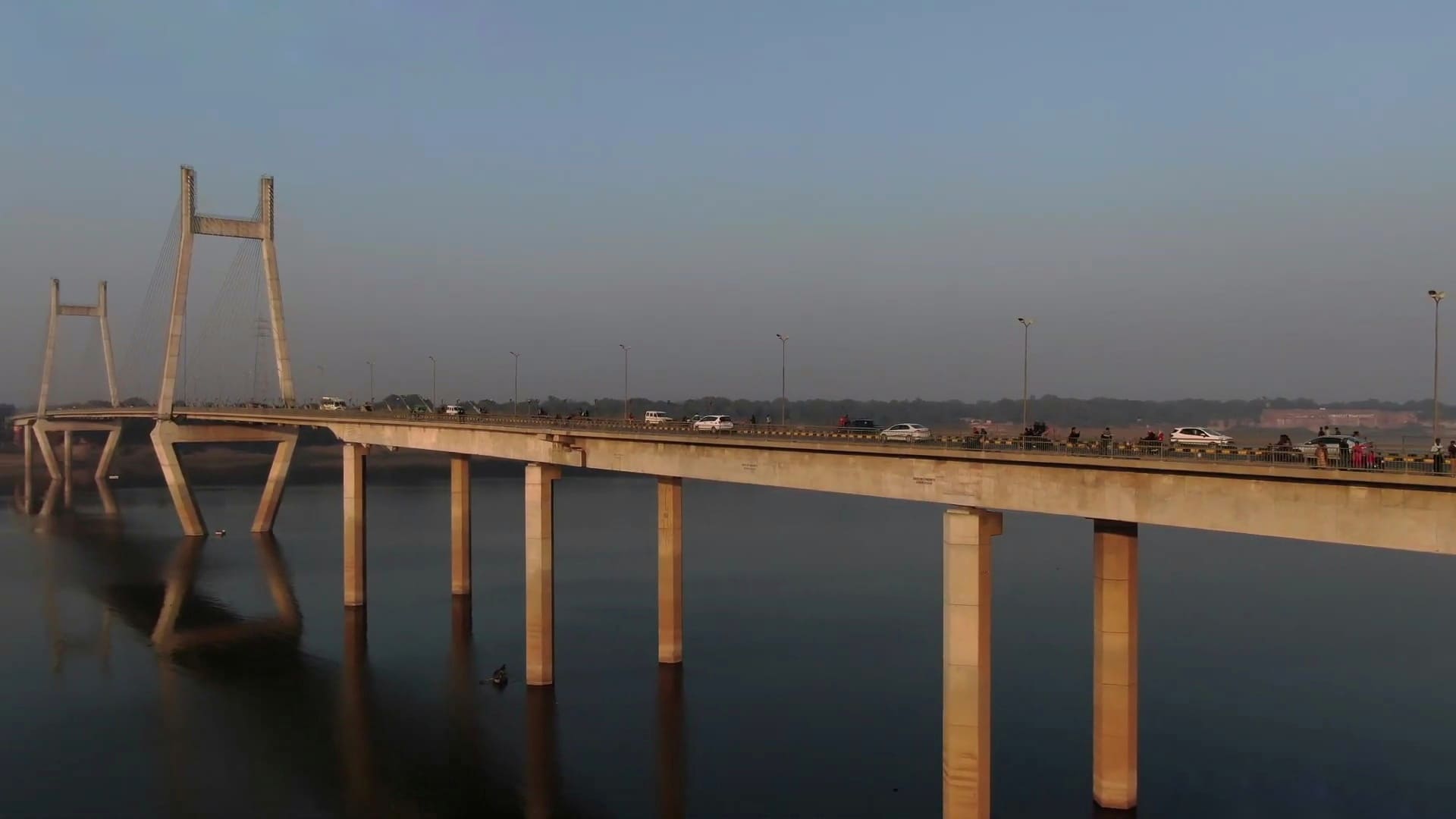The New Yamuna Bridge uses a semi-fan cable-stayed design with two tall concrete pylons rising from the river, from which multiple steel cables fan out to support the central spans.